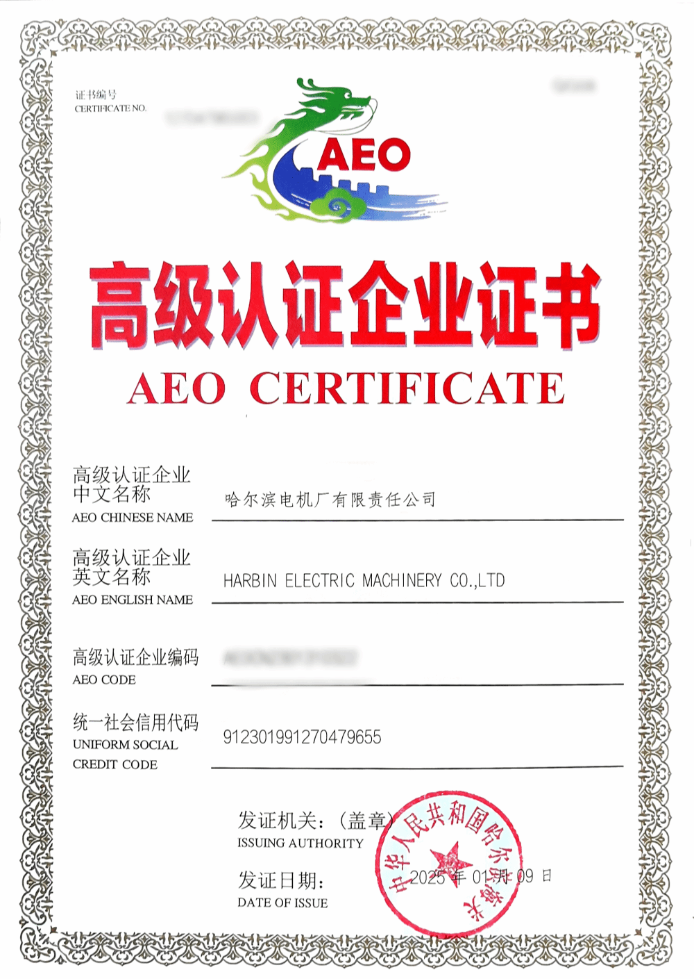 近日,哈爾濱電機廠有限責任公司獲得海關AEO高級認證。1月13日,哈爾濱海關舉辦高級認證企業(yè)(AEO)頒證儀式暨政策宣講會,為電機公司等企業(yè)頒發(fā)了《AEO高級認證企業(yè)證書》。